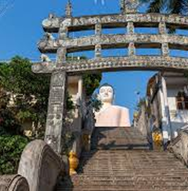 A sacred Buddhist site featuring a towering Buddha statue and peaceful surroundings.